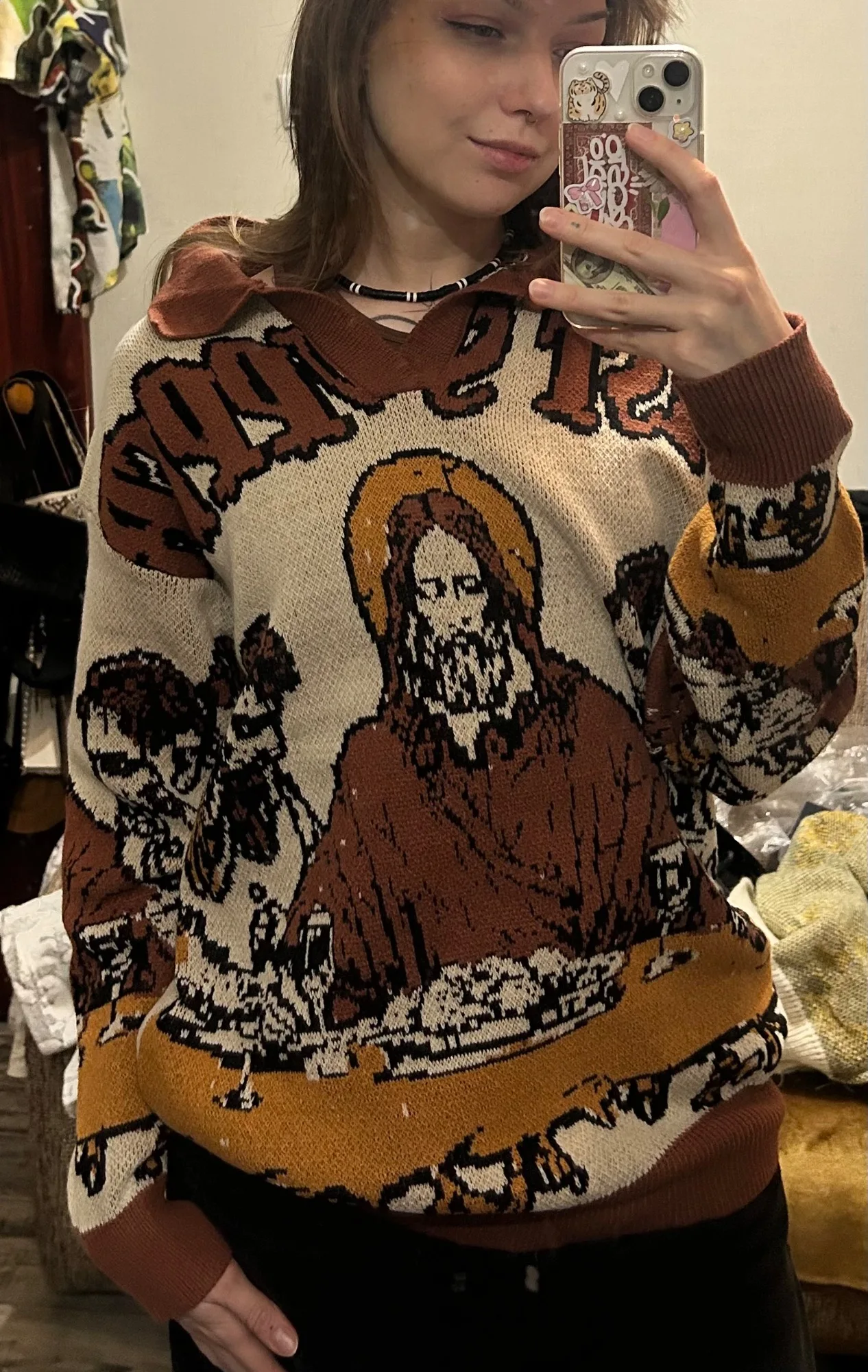 The The Last Supper Vintage Sweater by Haruja reimagines an iconic artwork through a bold streetwear lens. Featuring a vintage-style graphic inspired by The Last Supper, this sweater blends cultural reference with modern attitude. The oversized fit and soft knit construction make it perfect for everyday wear while delivering a statement that goes beyond fashion.